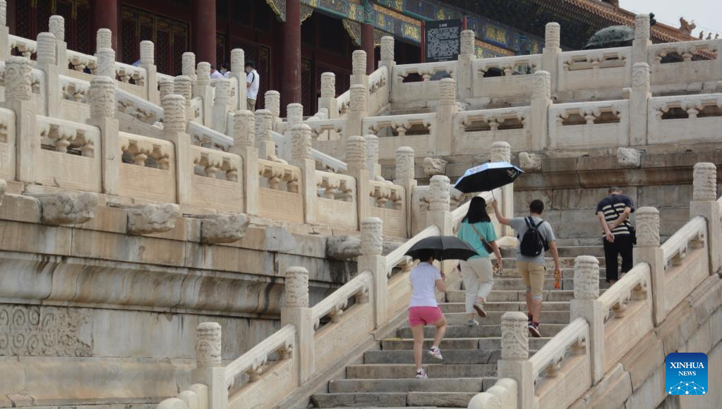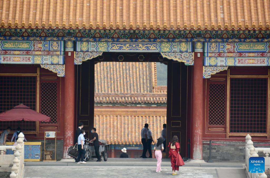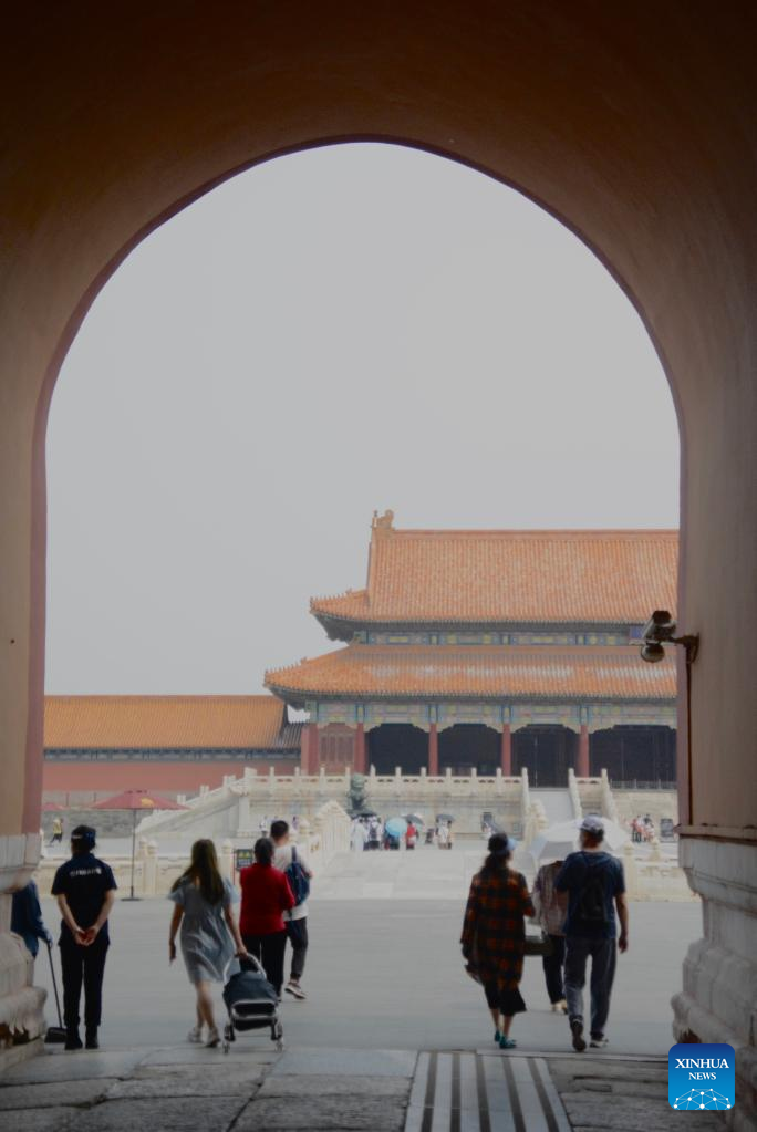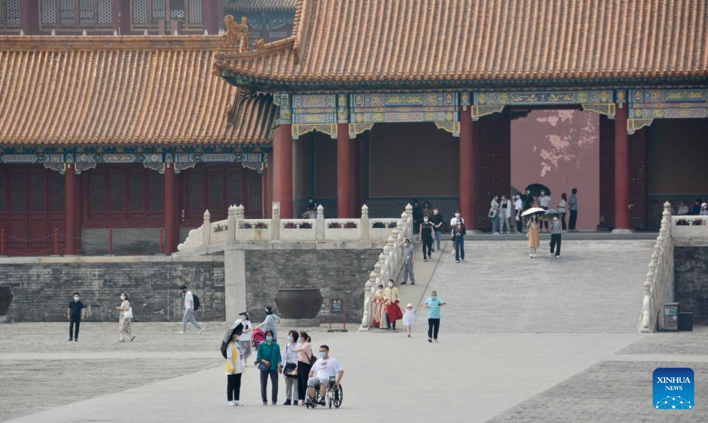 People visit the Palace Museum, also known as the Forbidden City, in Beijing, capital of China, June 19, 2022. As the epidemic situation in the city is improving, the number of visitors to the Palace Museum in Beijing has increased gradually. (Xinhua/Li Xin)