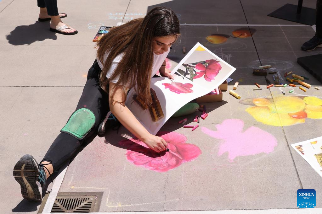 A chalk artist creates a work during Pasadena Chalk Festival in Pasadena, California, the United States, on June 18, 2022. The annual Pasadena Chalk Festival is held in Pasadena from June 18 to June 19, attracting over 500 chalk artists here to celebrate the festival. (Xinhua)