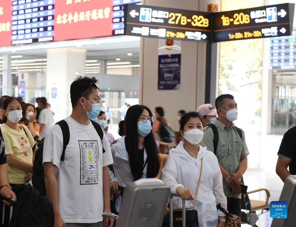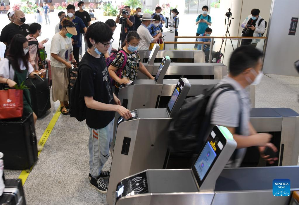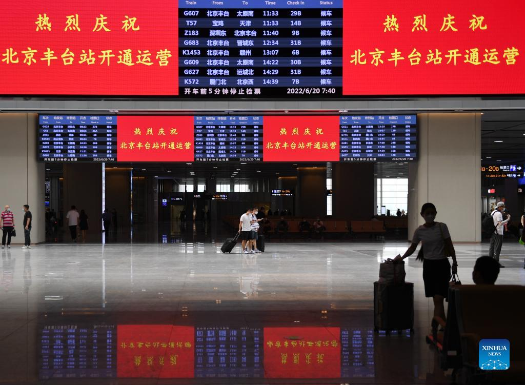 Passengers enter the Beijing Fengtai Railway Station in Beijing, capital of China, June 20, 2022. The largest passenger railway hub in Asia was put into operation Monday in Beijing as a four-year reconstruction breathes new life into the Chinese capital's oldest railway station. With a gross floor area of nearly 400,000 square meters, or 56 standard football pitches, Beijing Fengtai Railway Station has 32 rail tracks and 32 platforms and is able to accommodate a maximum of 14,000 passengers per hour. (Xinhua/Zhang Chenlin)