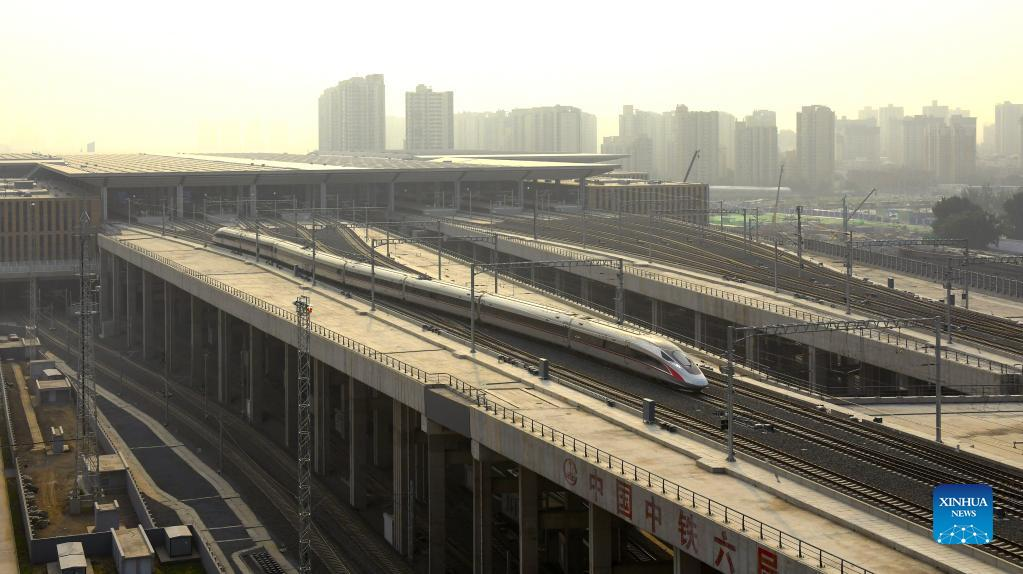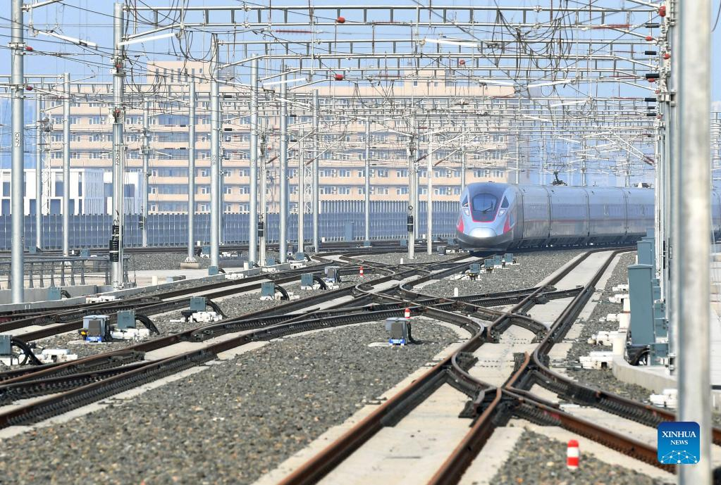 Train G601 departs from Beijing Fengtai Railway Station in Beijing, capital of China, June 20, 2022. The largest passenger railway hub in Asia was put into operation Monday in Beijing as a four-year reconstruction breathes new life into the Chinese capital's oldest railway station. With a gross floor area of nearly 400,000 square meters, or 56 standard football pitches, Beijing Fengtai Railway Station has 32 rail tracks and 32 platforms and is able to accommodate a maximum of 14,000 passengers per hour. (Xinhua/Zhang Chenlin)