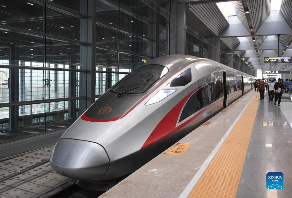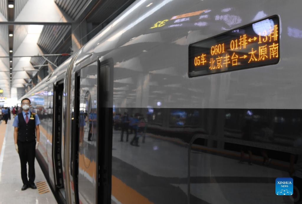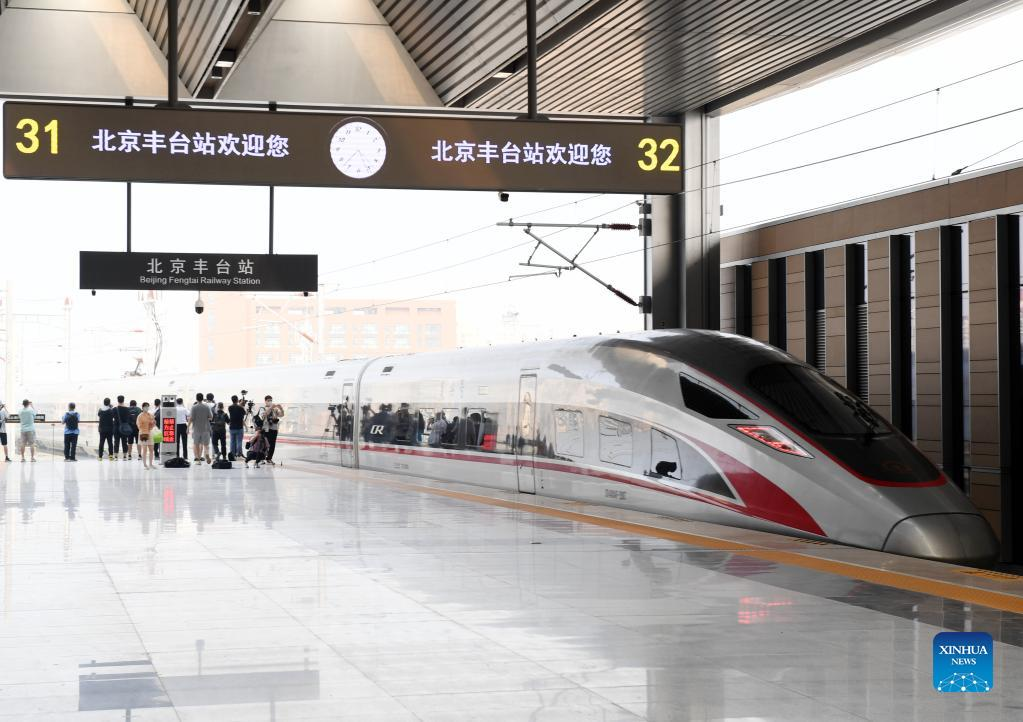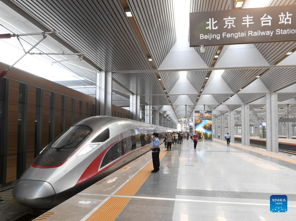 Train G601 is seen at Beijing Fengtai Railway Station in Beijing, capital of China, June 20, 2022. The largest passenger railway hub in Asia was put into operation Monday in Beijing as a four-year reconstruction breathes new life into the Chinese capital's oldest railway station. With a gross floor area of nearly 400,000 square meters, or 56 standard football pitches, Beijing Fengtai Railway Station has 32 rail tracks and 32 platforms and is able to accommodate a maximum of 14,000 passengers per hour. (Xinhua/Zhang Chenlin)