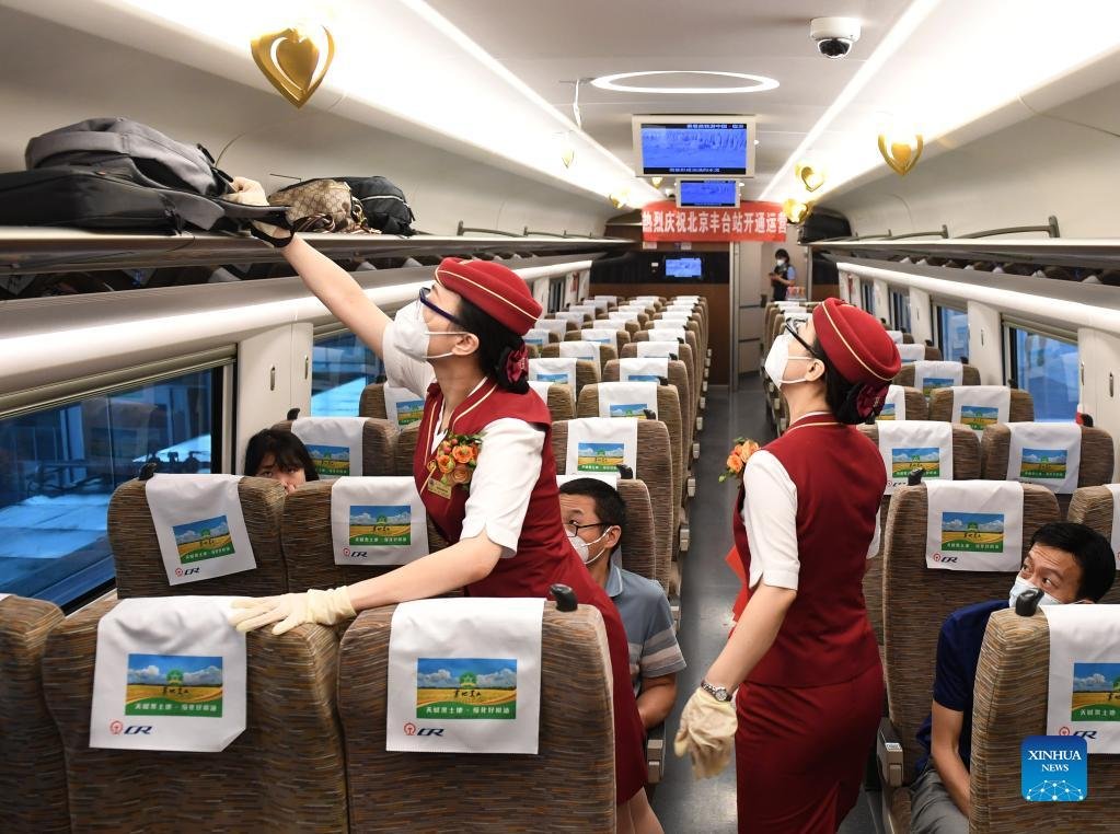 Attendants of train G601 arrange bags in Beijing Fengtai Railway Station in Beijing, capital of China, June 20, 2022. The largest passenger railway hub in Asia was put into operation Monday in Beijing as a four-year reconstruction breathes new life into the Chinese capital's oldest railway station. With a gross floor area of nearly 400,000 square meters, or 56 standard football pitches, Beijing Fengtai Railway Station has 32 rail tracks and 32 platforms and is able to accommodate a maximum of 14,000 passengers per hour. (Xinhua/Zhang Chenlin)