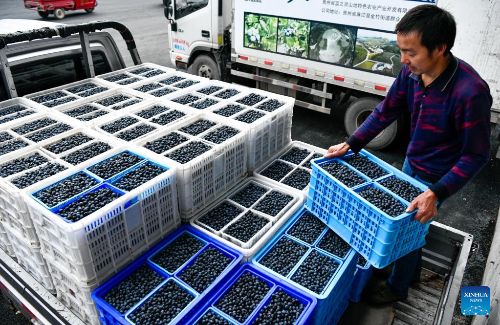A villager transports blueberries at a blueberry trade center in Majiang County, southwest China's Guizhou Province, June 18, 2022. More than 80,000 mu (about 5,333 hectares) of blueberries have entered harvest season in Majiang County of Guizhou, and the blueberry products are being sold to the rest of the country via online orders. (Xinhua/Yang Wenbin)