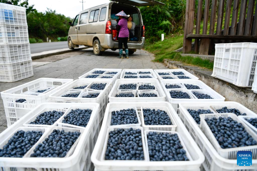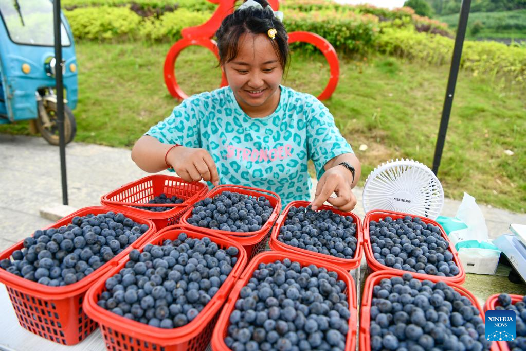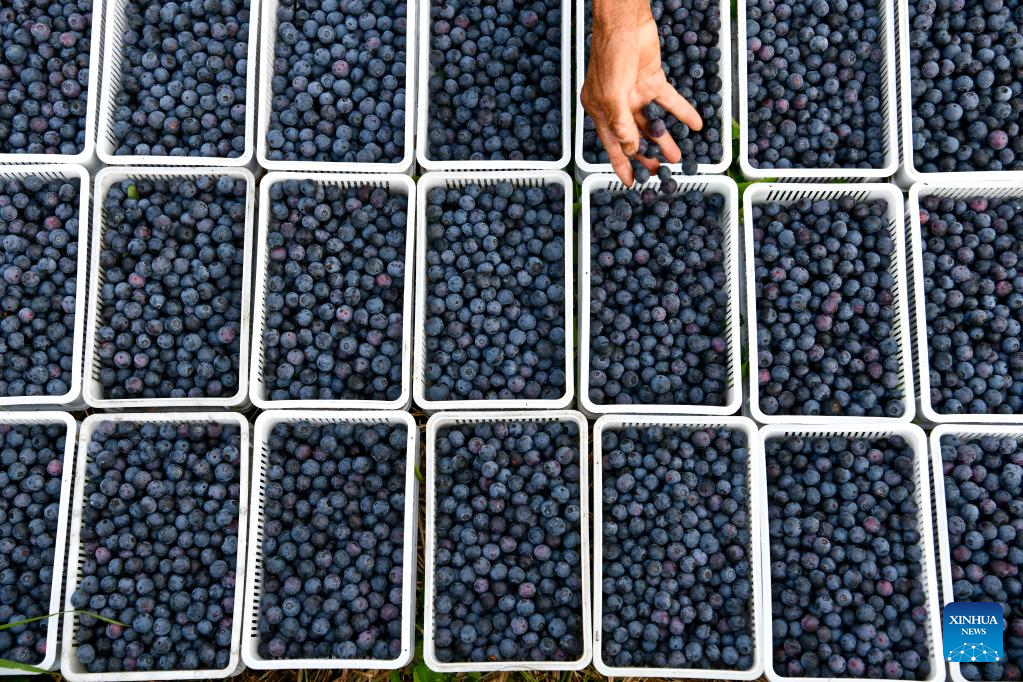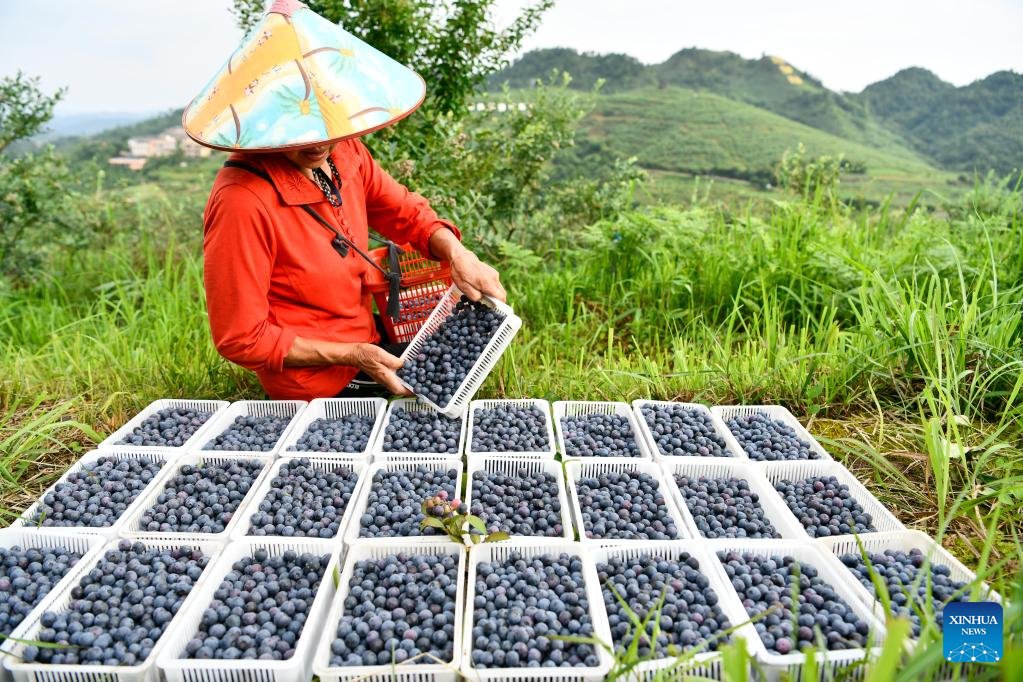 Photo shows blueberries collected at an ecological blueberry garden in Majiang County, southwest China's Guizhou Province, June 18, 2022. More than 80,000 mu (about 5,333 hectares) of blueberries have entered harvest season in Majiang County of Guizhou, and the blueberry products are being sold to the rest of the country via online orders. (Xinhua/Yang Wenbin)