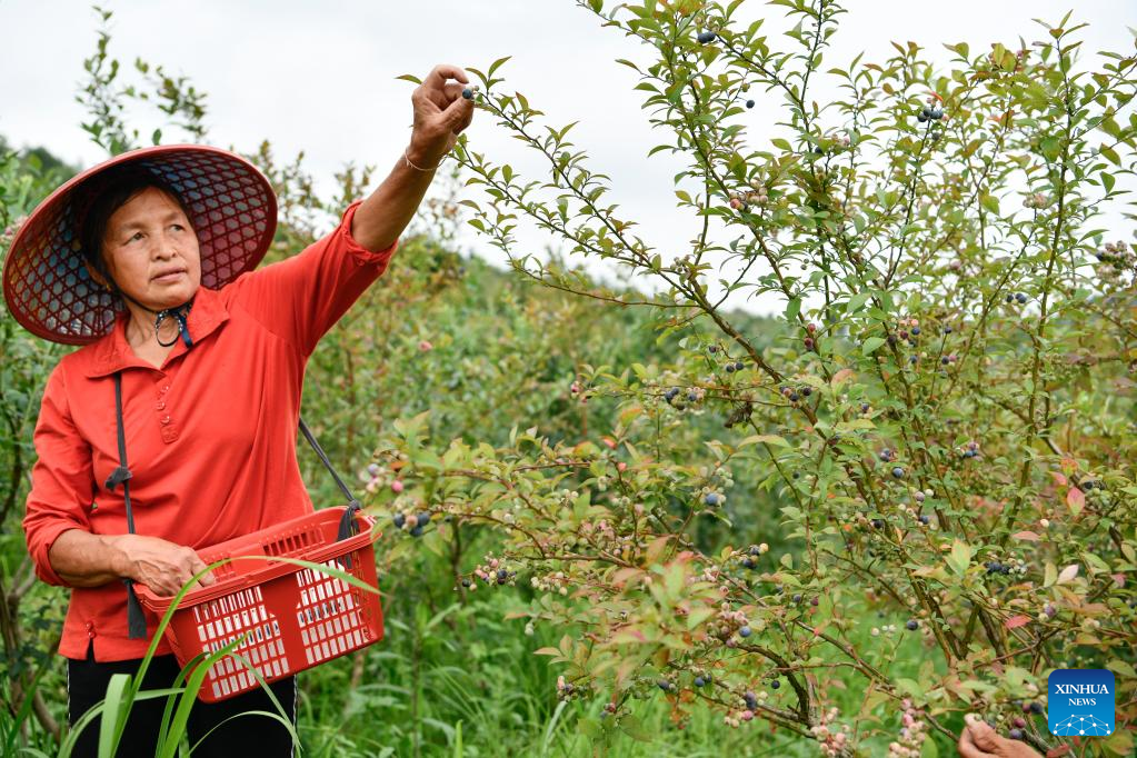 A villager collects blueberries at an ecological blueberry garden in Majiang County, southwest China's Guizhou Province, June 18, 2022. More than 80,000 mu (about 5,333 hectares) of blueberries have entered harvest season in Majiang County of Guizhou, and the blueberry products are being sold to the rest of the country via online orders. (Xinhua/Yang Wenbin)