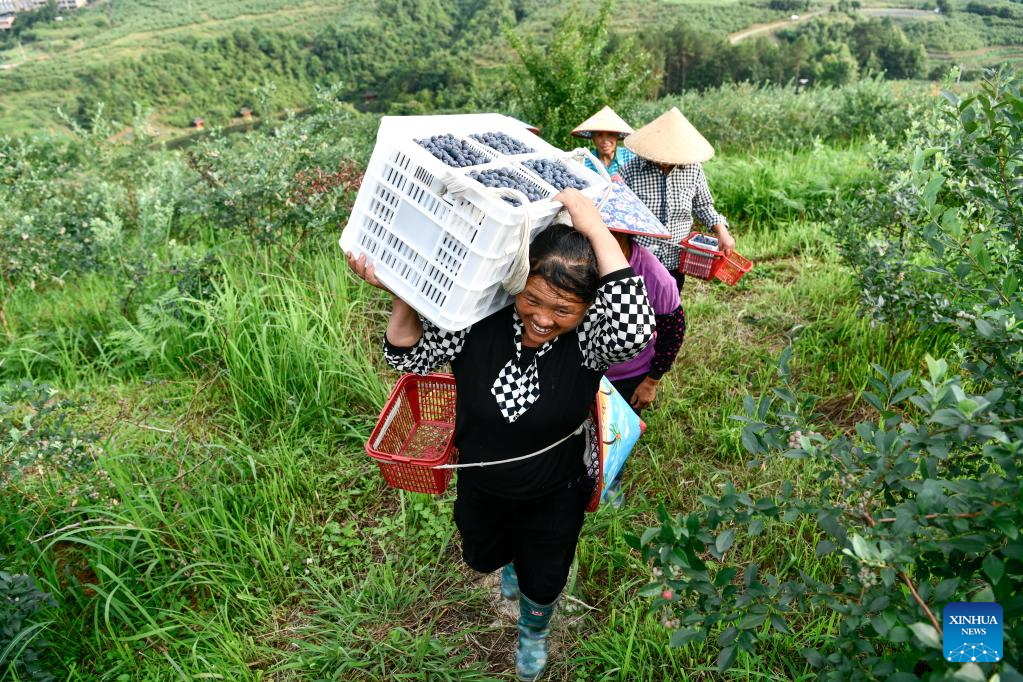 Villagers transport blueberries at an ecological blueberry garden in Majiang County, southwest China's Guizhou Province, June 18, 2022. More than 80,000 mu (about 5,333 hectares) of blueberries have entered harvest season in Majiang County of Guizhou, and the blueberry products are being sold to the rest of the country via online orders. (Xinhua/Yang Wenbin)