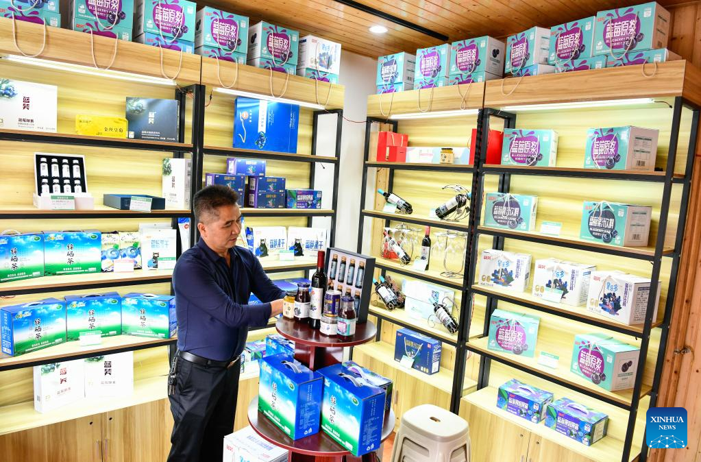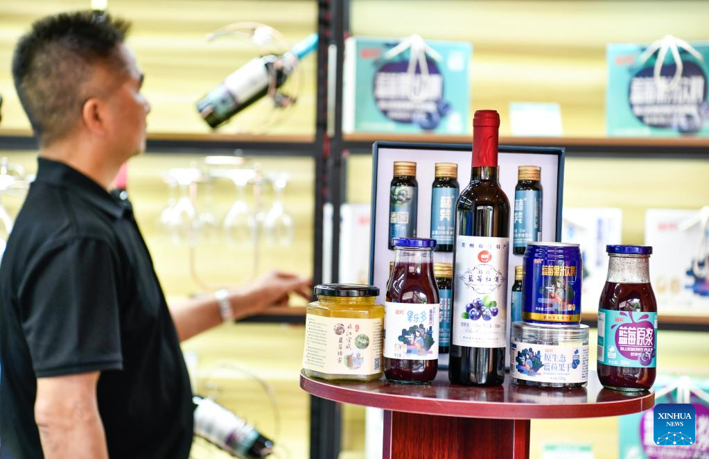 A staff member aranges blueberry products in Xiasi Township of Kaili City, southwest China's Guizhou Province, June 19, 2022. More than 80,000 mu (about 5,333 hectares) of blueberries have entered harvest season in Majiang County of Guizhou, and the blueberry products are being sold to the rest of the country via online orders. (Xinhua/Yang Wenbin)