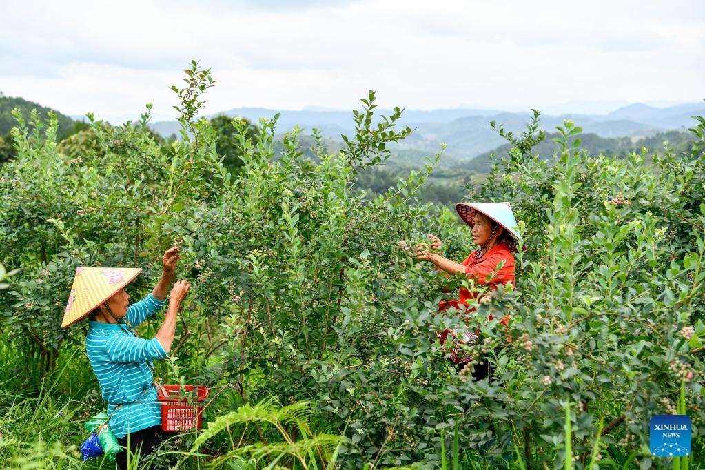 Villagers pick blueberries at an ecological blueberry garden in Majiang County, southwest China's Guizhou Province, June 18, 2022. More than 80,000 mu (about 5,333 hectares) of blueberries have entered harvest season in Majiang County of Guizhou, and the blueberry products are being sold to the rest of the country via online orders. (Xinhua/Yang Wenbin)