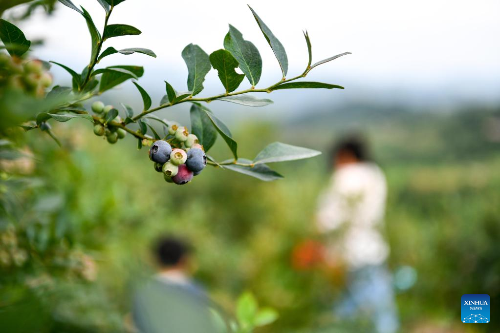 Tourists experience picking blueberries at an ecological blueberry garden in Majiang County, southwest China's Guizhou Province, June 18, 2022. More than 80,000 mu (about 5,333 hectares) of blueberries have entered harvest season in Majiang County of Guizhou, and the blueberry products are being sold to the rest of the country via online orders. (Xinhua/Yang Wenbin)