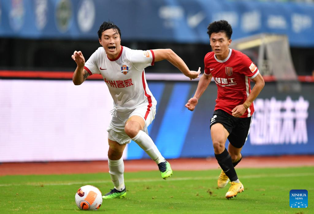 Liao Junjian (L) of Meizhou Hakka vies with Hu Hetao of Chengdu Rongcheng during their 2022 season Chinese Football Association Super League (CSL) match in Meizhou, south China's Guangdong Province, June 20, 2022. (Xinhua/Chen Zhenhai)