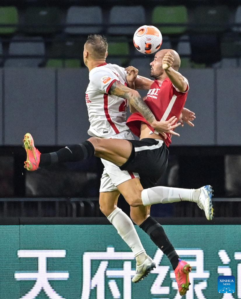 Rade Dugalic (L) of Meizhou Hakka vies with Romulo Jose Pacheco da Silva of Chengdu Rongcheng during their 2022 season Chinese Football Association Super League (CSL) match in Meizhou, south China's Guangdong Province, June 20, 2022. (Xinhua/Chen Xinbo)