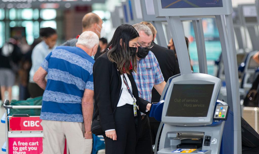 A staff member helps a man check in at Toronto Pearson International Airport in Mississauga, Ontario, Canada, on June 20, 2022. The Canadian federal government started to suspend vaccination requirements against COVID-19 for domestic and outbound travel, federally regulated transportation sectors and federal government employees as of June 20. (Photo by Zou Zheng/Xinhua)