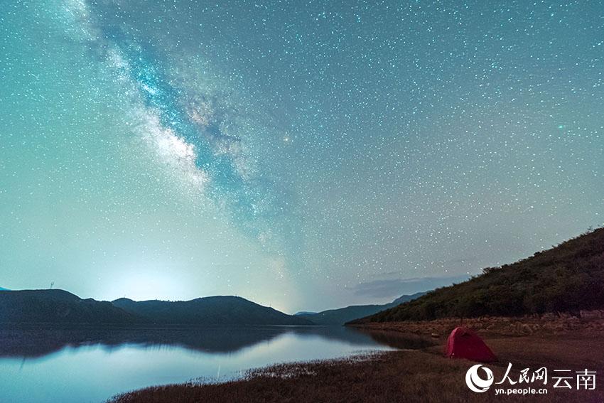 Photo shows the starry sky over the Haixihai Lake of southwest China's Yunnan Province. (Photo/Luo Xincai)