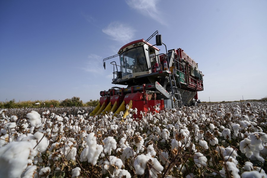 A cotton picker works in fields in Yuli County, northwest China's Xinjiang Uygur Autonomous Region, Oct. 15, 2021. (Xinhua/Zhao Ge)