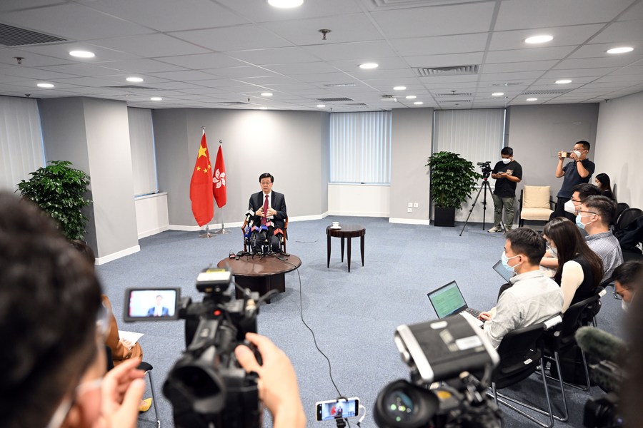 Photo taken on June 7, 2022 shows John Lee, the incoming sixth-term chief executive of the Hong Kong Special Administrative Region (HKSAR) during an interview. (Xinhua/Jin Liangkuai)