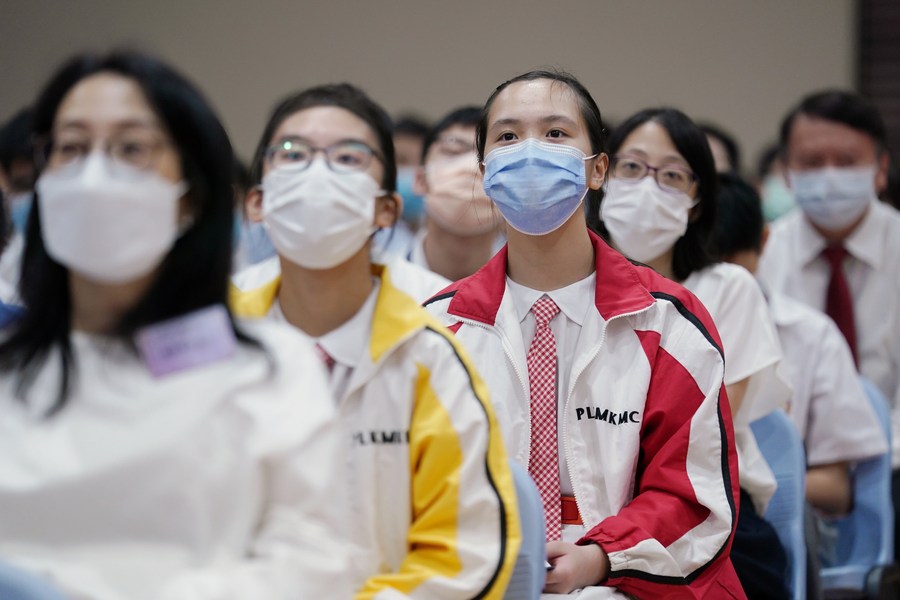Students attend a lecture given by space scientists at the Po Leung Kuk Ho Yuk Ching College in south China's Hong Kong, June 25, 2021. (Xinhua/Wang Shen)