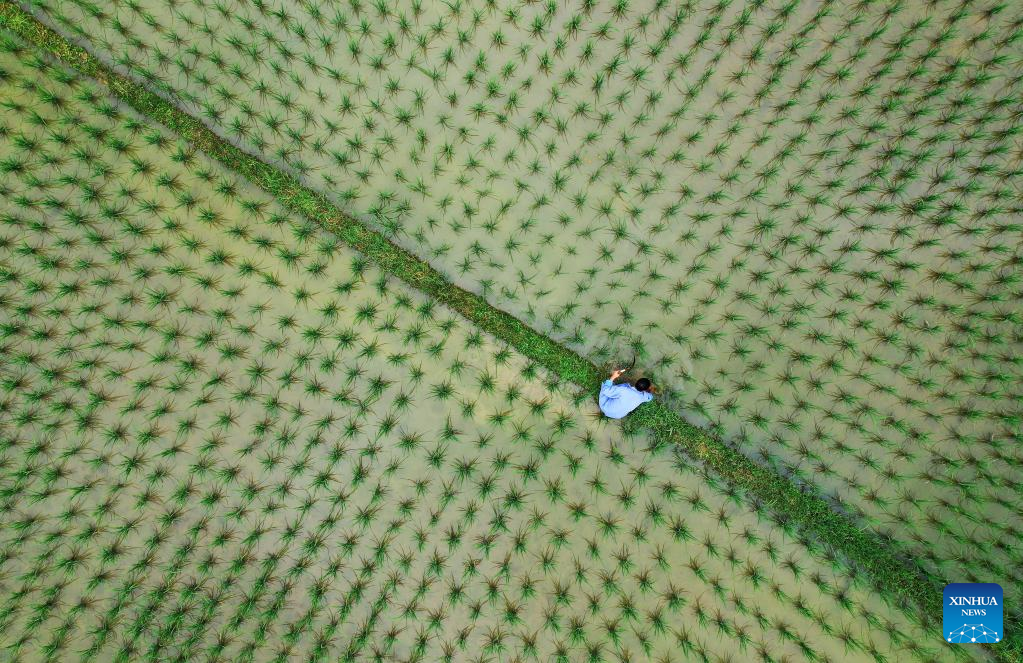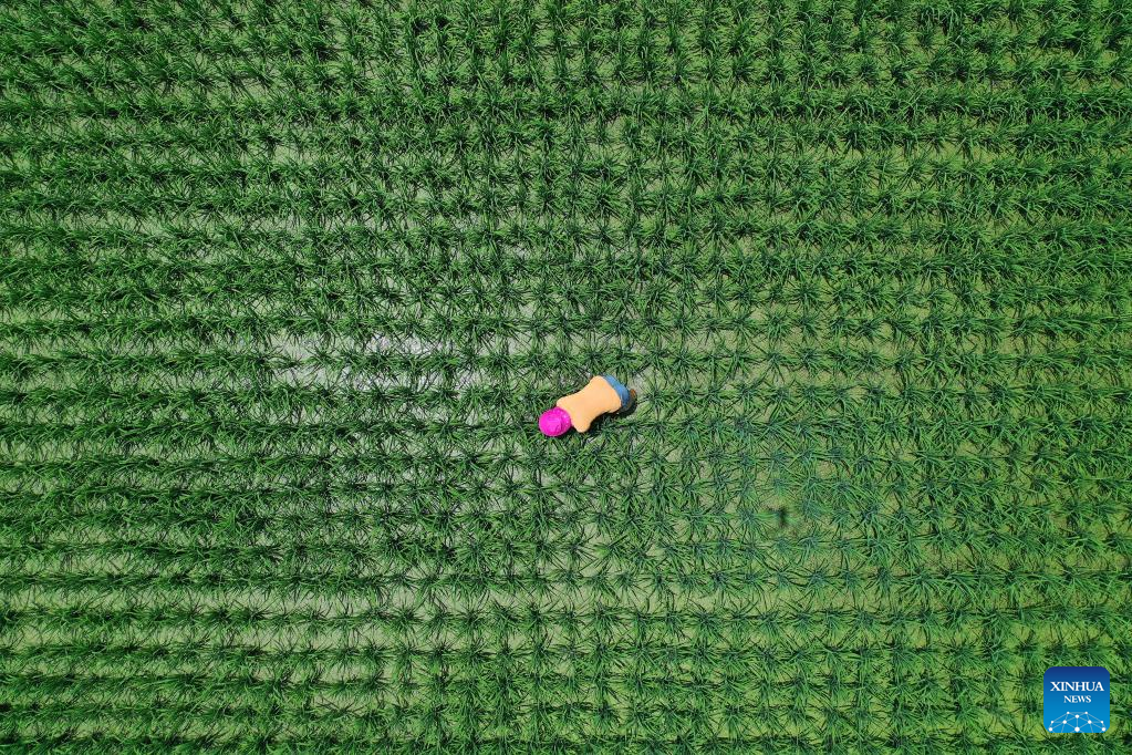 A farmer works in a rice field in Tengqiao Township of Wenzhou, east China's Zhejiang Province, June 21, 2022. (Photo by Su Qiaojiang/Xinhua)