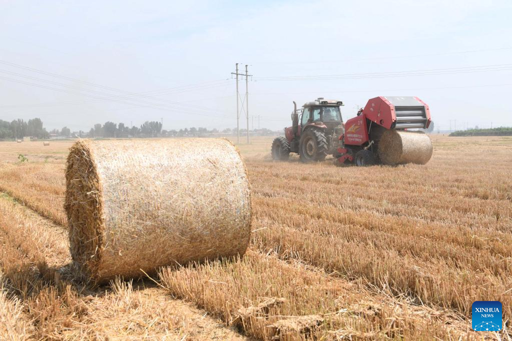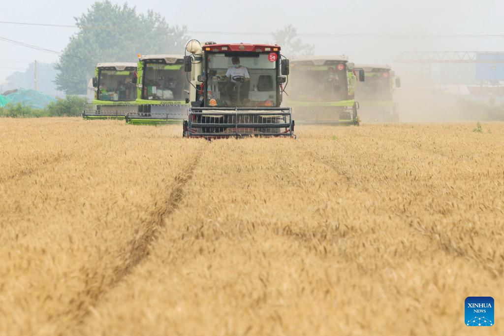 Harvesters work in a wheat field in Datongzhuang Village of Tangshan, north China's Hebei Province, June 21, 2022. (Photo by Li Xiuqing/Xinhua)