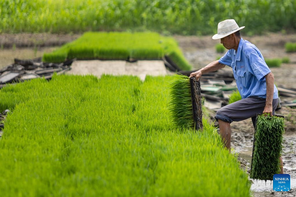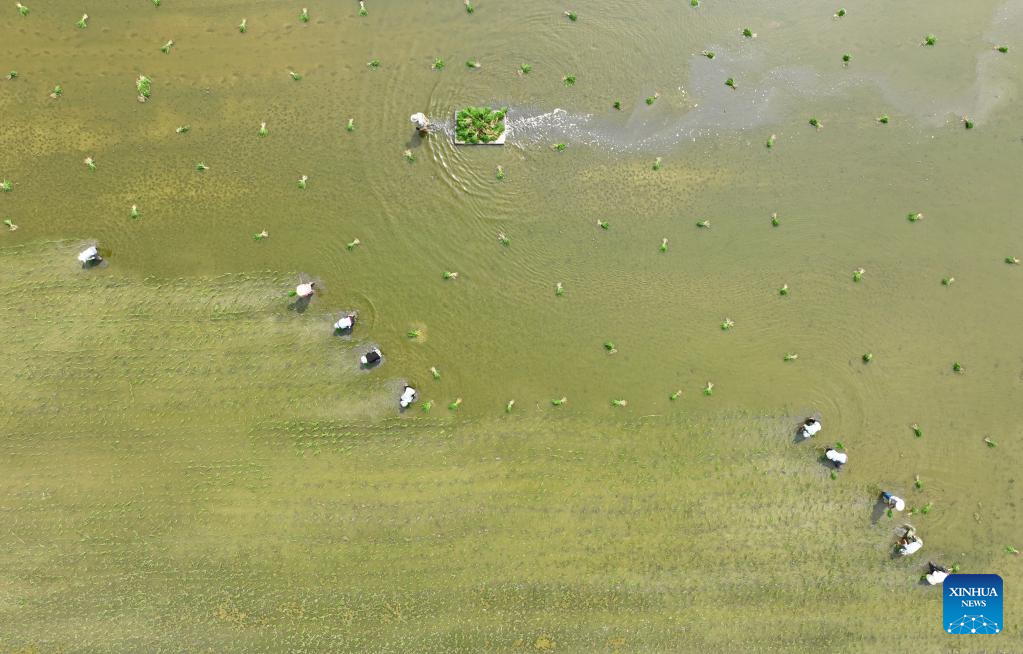 Aerial photo shows farmers transporting rice seedlings in Hongze District of Huaian, east China's Jiangsu Province, June 21, 2022. (Photo by Wan Zhen/Xinhua)