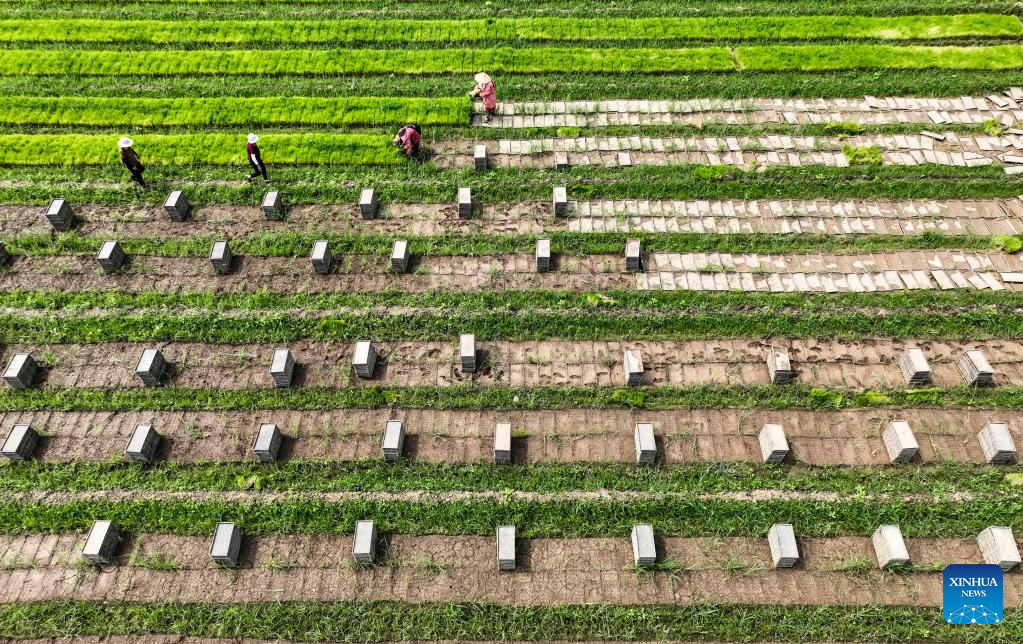 Farmers work in the herb fields in Zhangjiawa Village of Jingxing County, Shijiazhuang, north China's Hebei Province, June 21, 2022. (Photo by Zhang Xiaofeng/Xinhua)