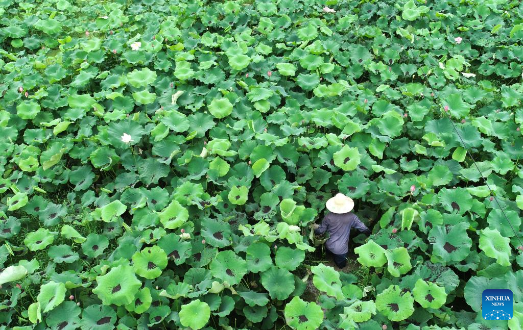 Aerial photo shows a farmer working in a lotus field in Luowu Village of Tongdao Dong Autonomous County, central China's Hunan Province, June 21, 2022. (Photo by Su Yongzhu/Xinhua)
