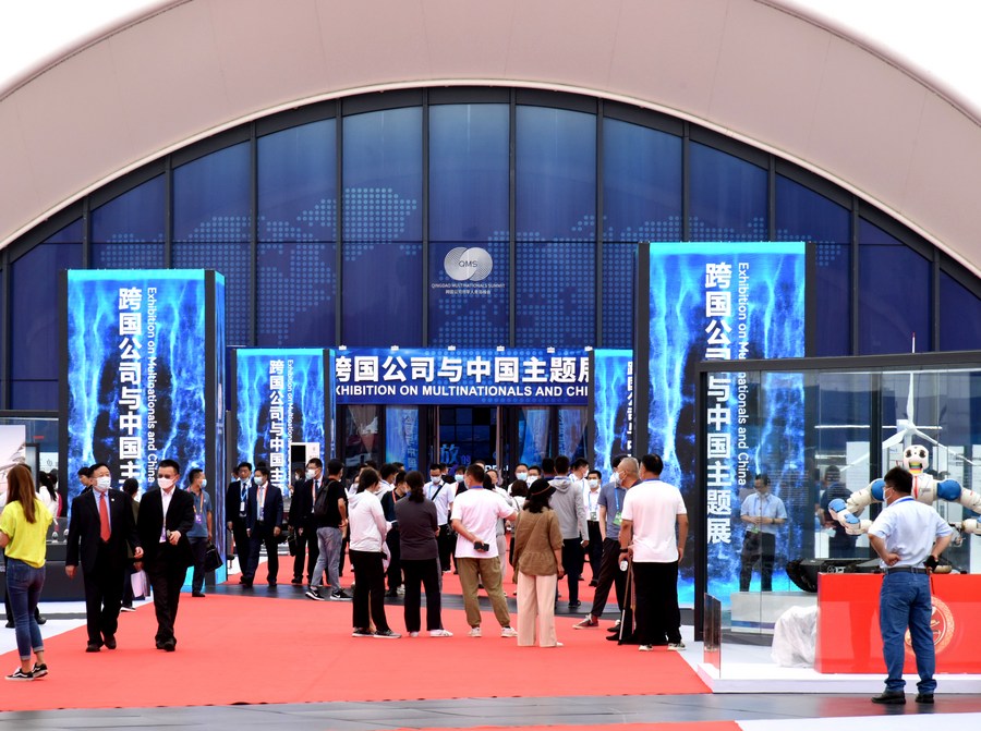 Visitors view the Exhibition on Multinationals and China during the third Qingdao Multinationals Summit in Qingdao, east China's Shandong Province, June 19, 2022. (Xinhua/Li Ziheng)