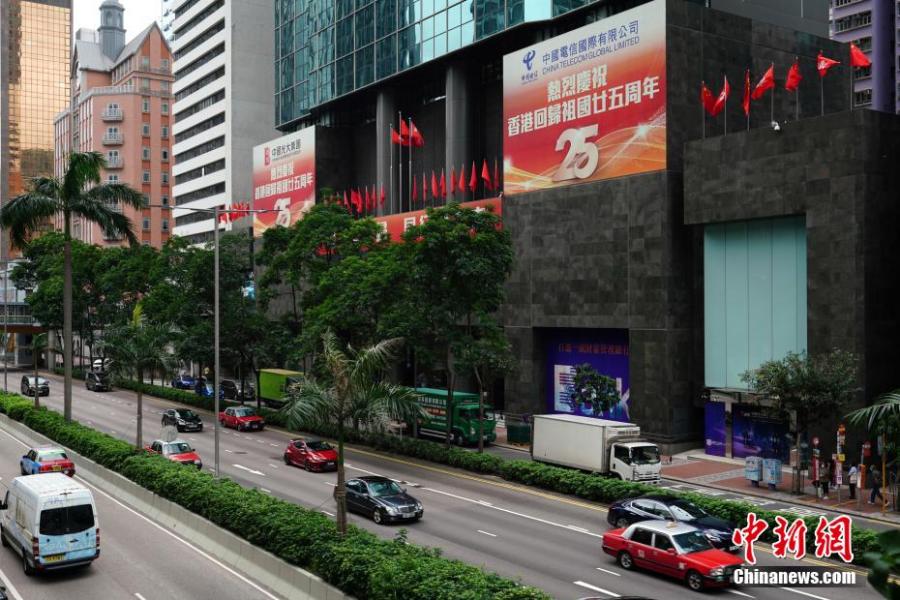 Posters celebrating the 25th anniversary of Hong Kong's return to the motherland are seen in the Hong Kong Special Administrative Region, June, 21, 2022. (Photo: China News Service/Zhang Wei)