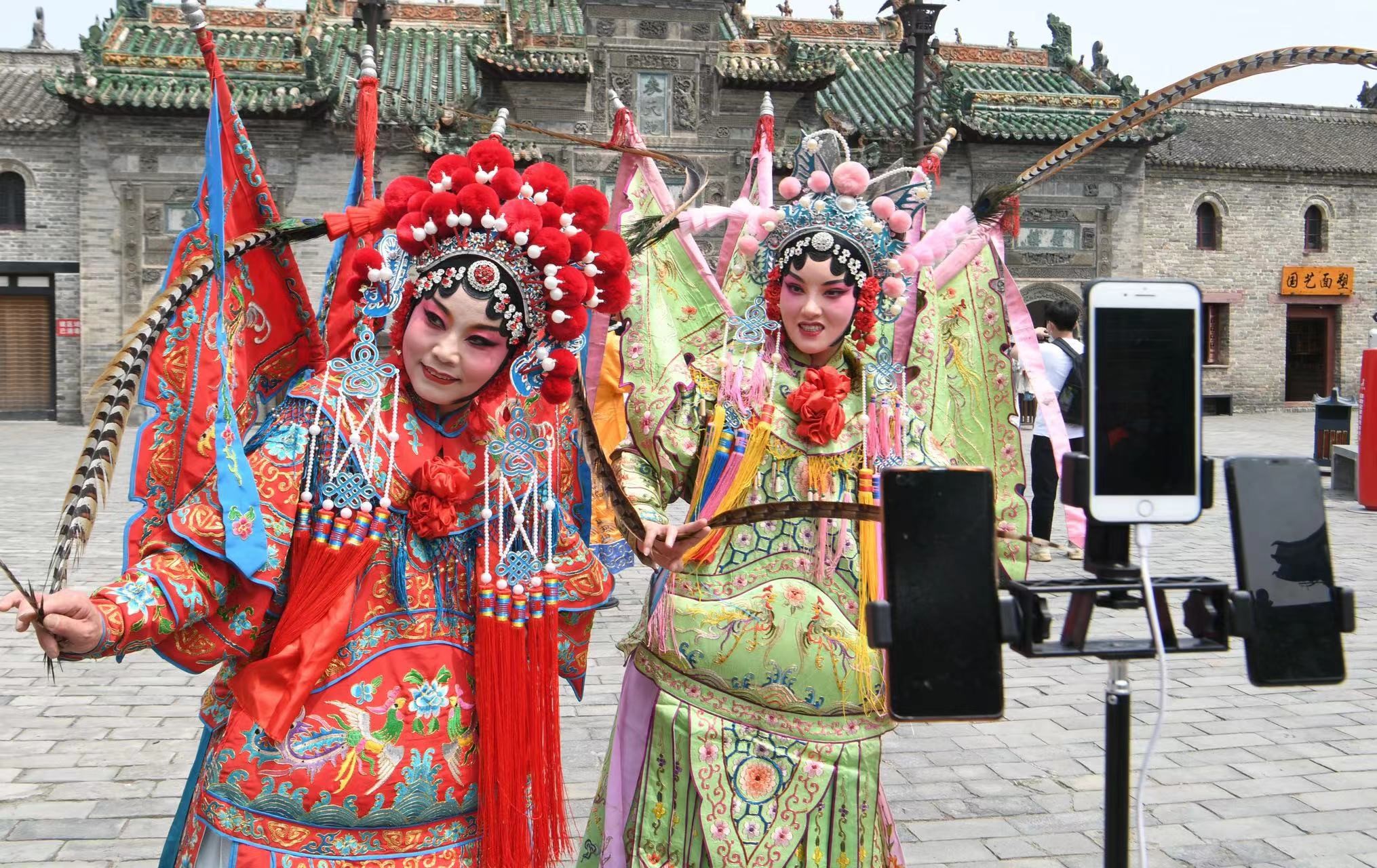 Actors of Bang Opera, a type of traditional Chinese opera, make videos of classic local opera pieces at Huaxilou scenic area in Bozhou city, east China’s Anhui province, April 27, 2022. (People’s Daily Online/Zhang Yanlin)