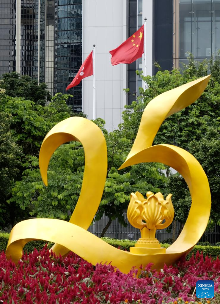 Photo taken on June 22, 2022 shows an installation marking the 25th anniversary of Hong Kong's return to the motherland in a park in Hong Kong, south China.