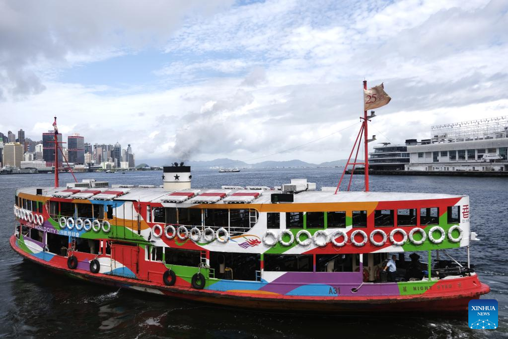 A ferry with flags marking the 25th anniversary of Hong Kong's return to the motherland sails at the Victoria Harbour in Hong Kong, south China, June 22, 2022.