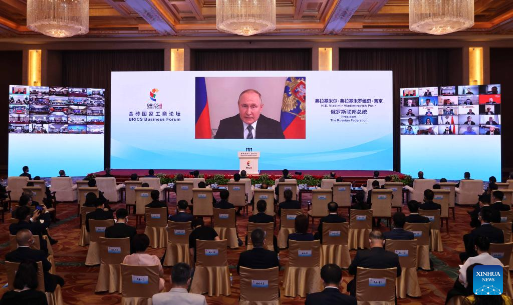 Russian President Vladimir Putin addresses the opening ceremony of the BRICS Business Forum in virtual format, June 22, 2022. (Xinhua/Yin Gang)