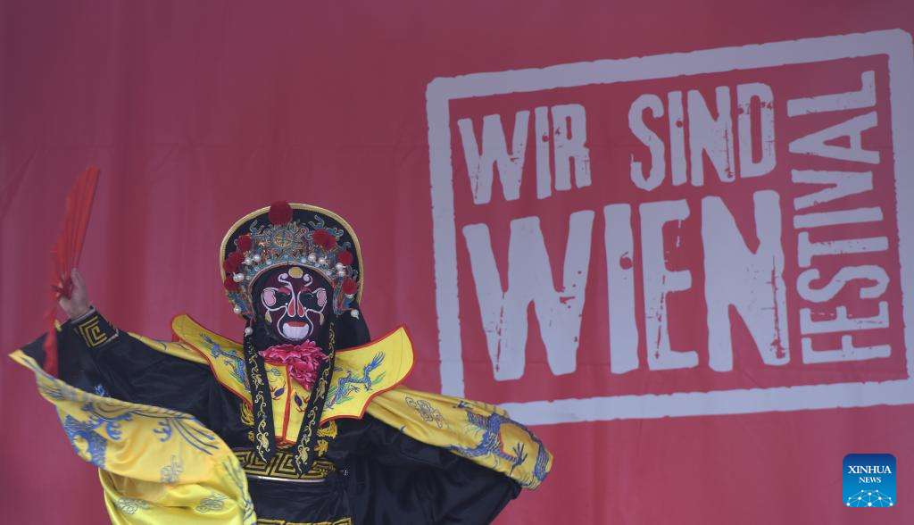 An artist performs Sichuan opera "Bianlian," also known as face-changing, during the event of "Austria meets China" in WIR SIND WIEN.FESTIVAL 2022 in Vienna, Austria, June 22, 2022. The event of "Austria meets China" was held in WIR SIND WIEN.FESTIVAL 2022 on Wednesday. (Xinhua/Guo Chen)
