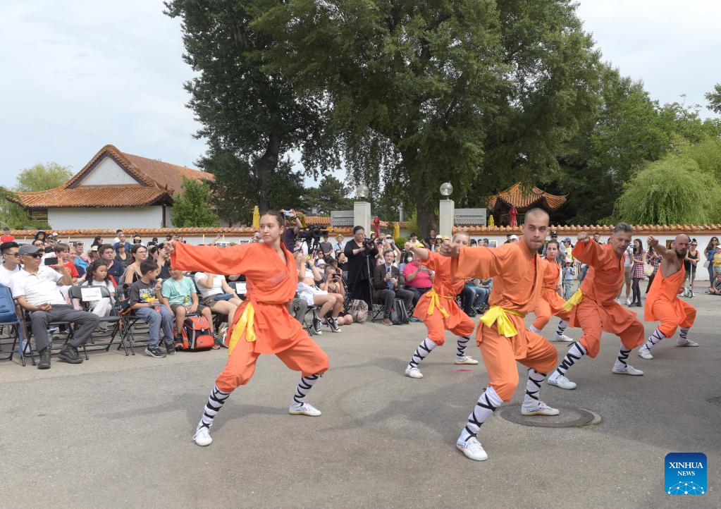 Kung Fu fans perform Chinese Kung Fu, Chinese martial arts, during the event of "Austria meets China" in WIR SIND WIEN.FESTIVAL 2022 in Vienna, Austria, June 22, 2022. The event of "Austria meets China" was held in WIR SIND WIEN.FESTIVAL 2022 on Wednesday. (Xinhua/Guo Chen)
