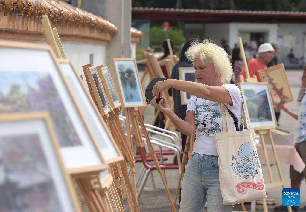 A citizen visits a photo exhibition about Chinese gardens during the event of "Austria meets China" in WIR SIND WIEN.FESTIVAL 2022 in Vienna, Austria, June 22, 2022. The event of "Austria meets China" was held in WIR SIND WIEN.FESTIVAL 2022 on Wednesday. (Xinhua/Guo Chen)