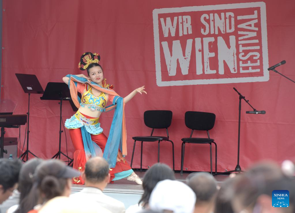 A dancer performs a traditional Chinese dance during the event of "Austria meets China" in WIR SIND WIEN.FESTIVAL 2022 in Vienna, Austria, June 22, 2022. The event of "Austria meets China" was held in WIR SIND WIEN.FESTIVAL 2022 on Wednesday. (Xinhua/Guo Chen)