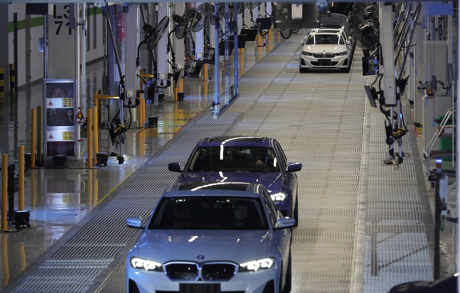 BMW i3 electric cars are pictured during the inauguration ceremony of Plant Lydia of BMW Brilliance Automotive (BBA) in Tiexi District of Shenyang, northeast China's Liaoning Province, June 23, 2022. (Xinhua/Yang Qing)