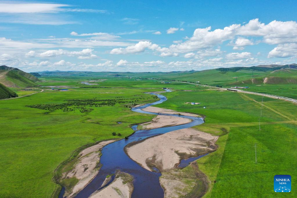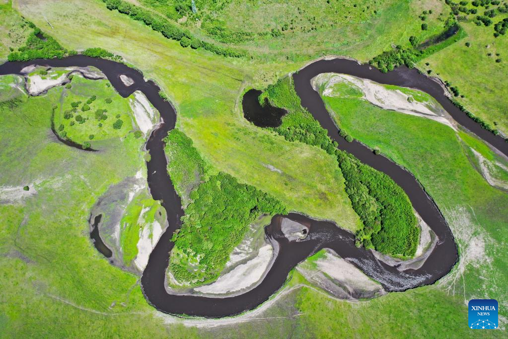 Aerial photo taken on June 23, 2022 shows a river running through the Ulan Mod grassland in Horqin Right Wing Front Banner of Hinggan League, north China's Inner Mongolia Autonomous Region. (Xinhua/Liu Lei)