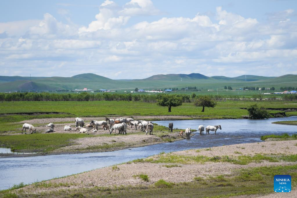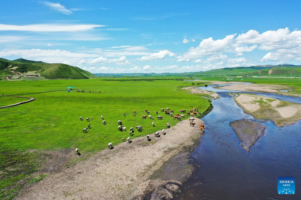 A herd of cattle and horses forage at the Ulan Mod grassland in Horqin Right Wing Front Banner of Hinggan League, north China's Inner Mongolia Autonomous Region, June 23, 2022. (Xinhua/Liu Lei)