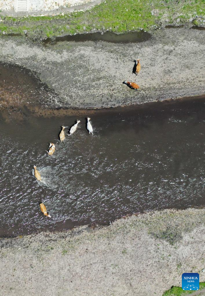 Aerial photo taken on June 23, 2022 shows a herd of cattle crossing a river on the Ulan Mod grassland in Horqin Right Wing Front Banner of Hinggan League, north China's Inner Mongolia Autonomous Region. (Xinhua/Liu Lei)