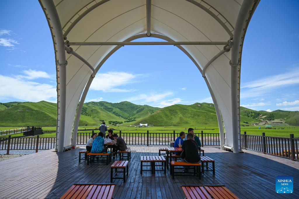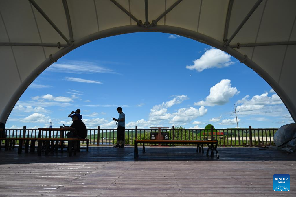 Tourists take a rest at a scenic spot of the Ulan Mod grassland in Horqin Right Wing Front Banner of Hinggan League, north China's Inner Mongolia Autonomous Region, June 23, 2022. (Xinhua/Liu Lei)
