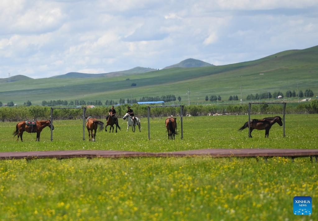 Tourists ride horses at the Ulan Mod grassland in Horqin Right Wing Front Banner of Hinggan League, north China's Inner Mongolia Autonomous Region, June 23, 2022. (Xinhua/Liu Lei)
