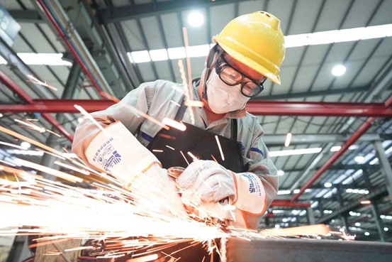 A worker produces a batch of elevators at a company in Huzhou city, east China’s Zhejiang province, for delivery to Russia and other countries along the Belt and Road Initiative (BRI), July 15, 2020. (People’s Daily Online/Zhang Bin)