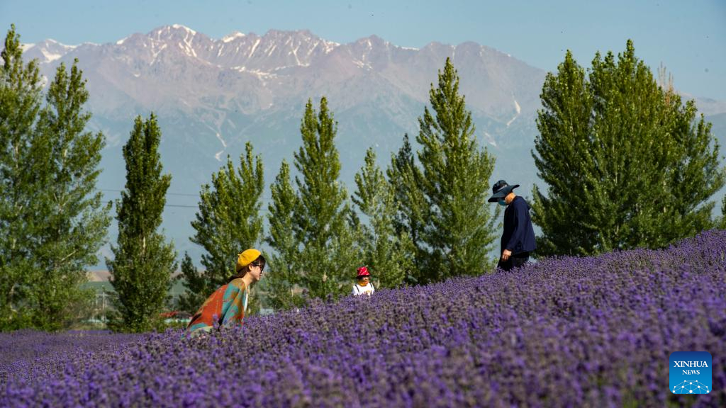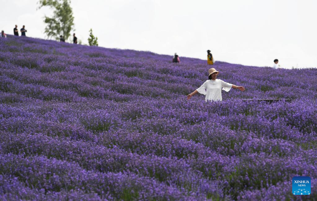 Tourists pose for photos in lavender fields in Sigong Village, Huocheng County of northwest China's Xinjiang Uygur Autonomous Region, June 19, 2022. Sigong Village has planted 12,000 mu (about 800 hectares) of lavender. The lavender planting bases here have promoted local tourism and lavendar processing industry. In 2021, per capita income in Silong Village reached 25,000 yuan (3,735 US dollars). (Xinhua/Zhao Ge)