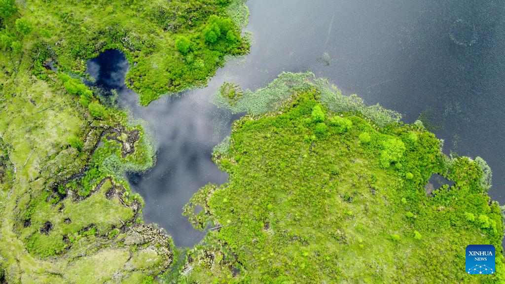 Aerial photo taken on June 24, 2022 shows the scenery of Dujuan Lake in the Arxan National Forest Park, north China's Inner Mongolia Autonomous Region. (Xinhua/Bei He)