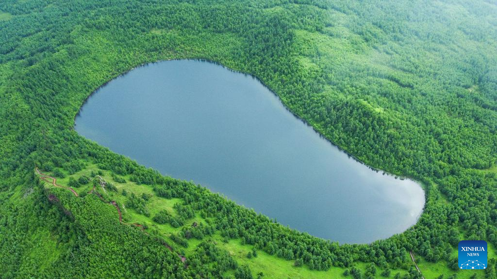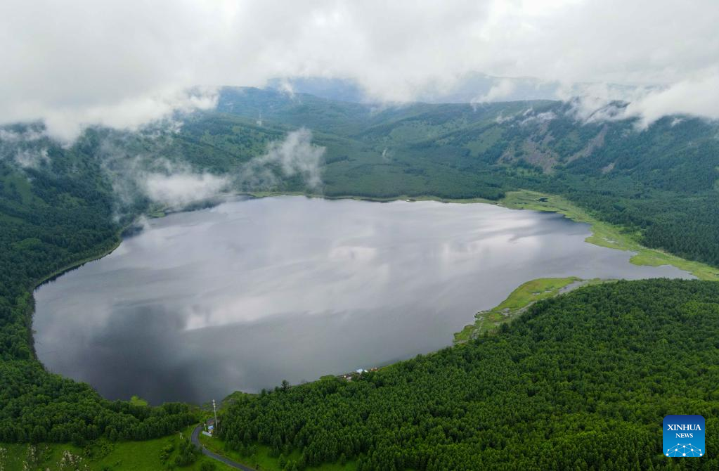 Aerial photo taken on June 24, 2022 shows the scenery of Arxan Tianchi (Heavenly Lake) in the Arxan National Forest Park, north China's Inner Mongolia Autonomous Region. (Xinhua/Wang Zecong)