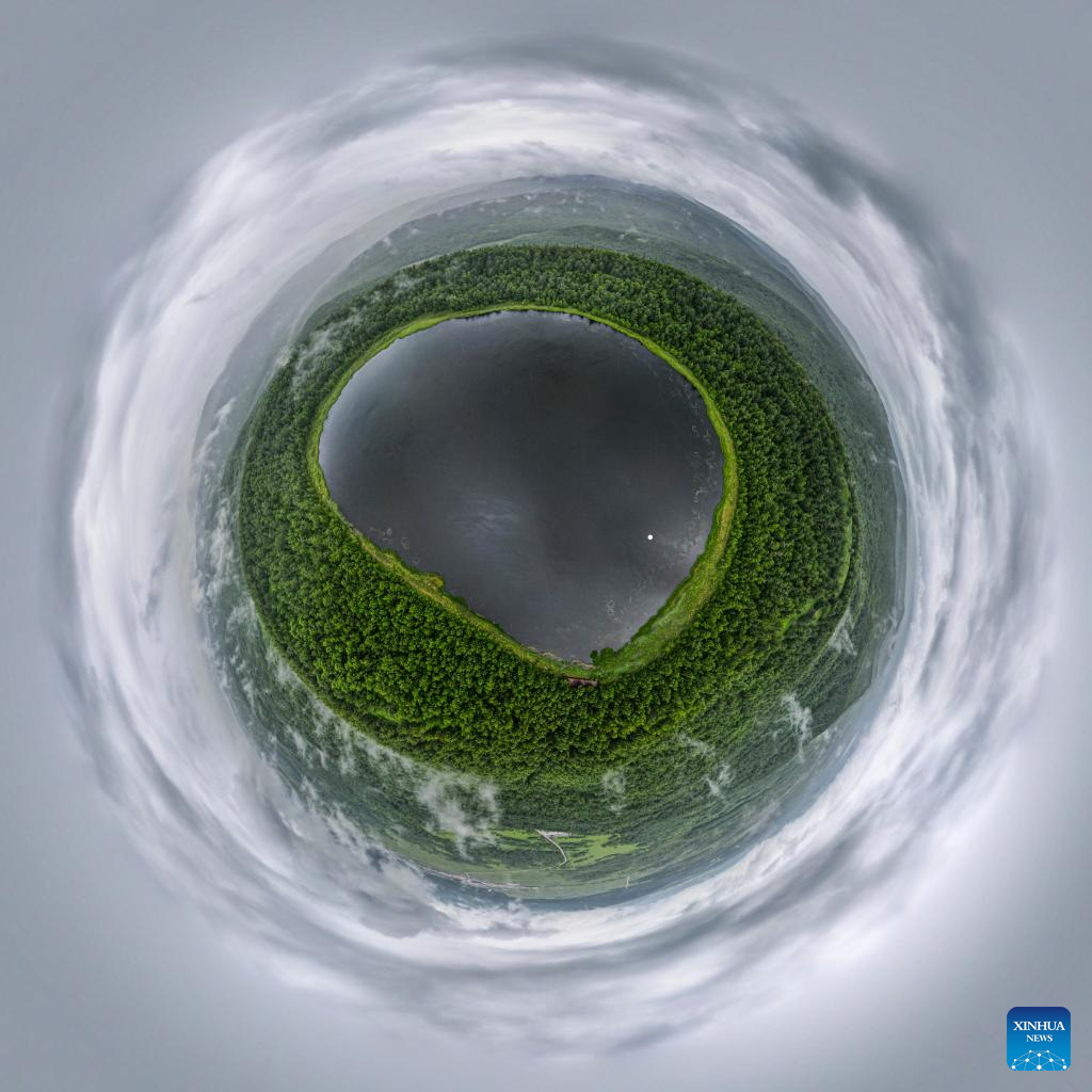 Aerial panoramic photo taken on June 24, 2022 shows the Wusulangzi Lake in the Arxan National Forest Park, north China's Inner Mongolia Autonomous Region. (Xinhua/Wang Zecong)