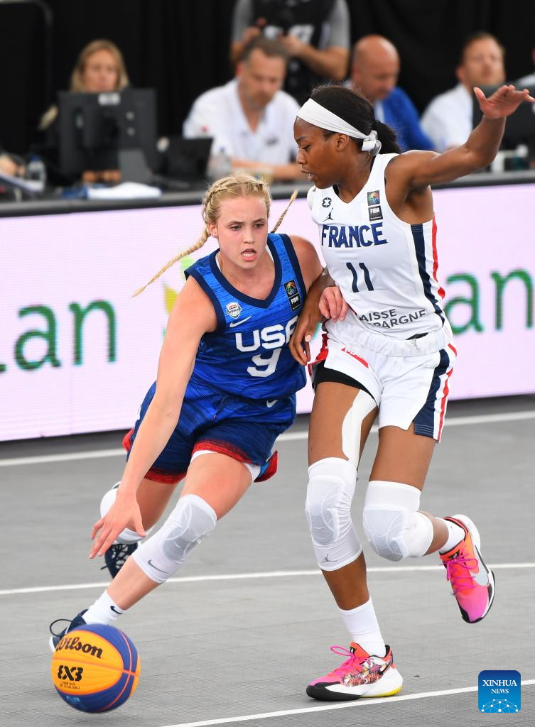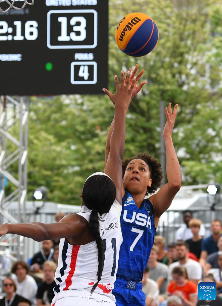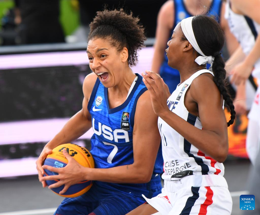Cierra Burdick (L) of the United States competes during the FIBA 3X3 World Cup women's pool round match between the United States and France in Antwerp, Belgium, June 24, 2022. (Xinhua/Ren Pengfei)