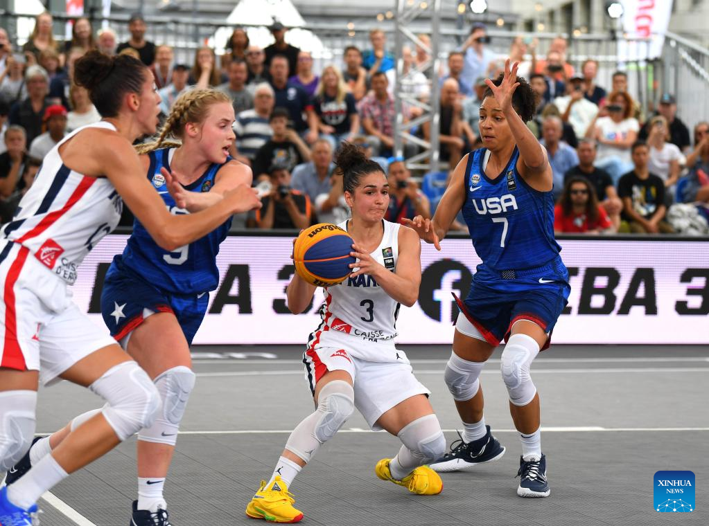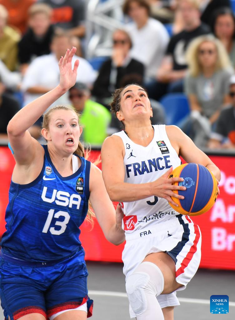 Hortense Limouzin (2nd R) of France competes during the FIBA 3X3 World Cup women's pool round match between the United States and France in Antwerp, Belgium, June 24, 2022. (Xinhua/Ren Pengfei)