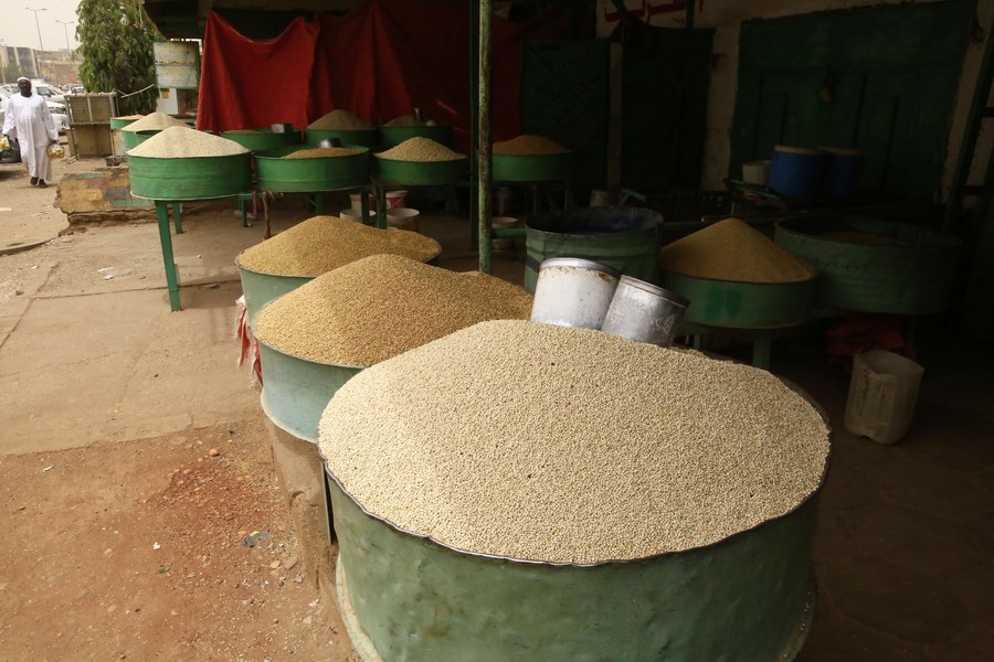 Photo taken on May 22, 2022 shows a grain shop at a local market in Khartoum, Sudan. (Photo by Mohamed Khidir/Xinhua)