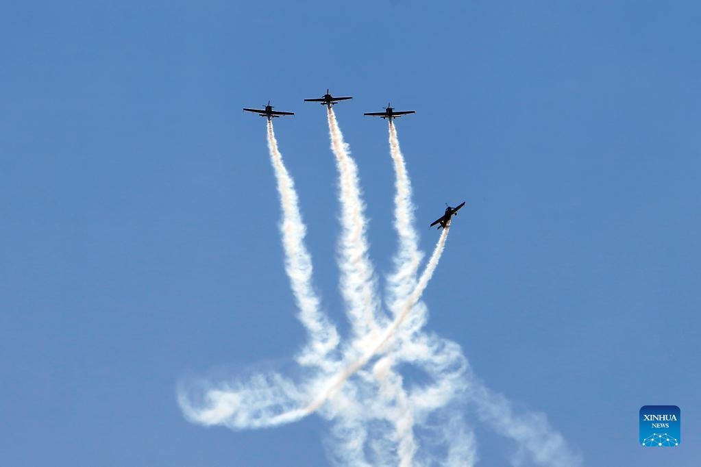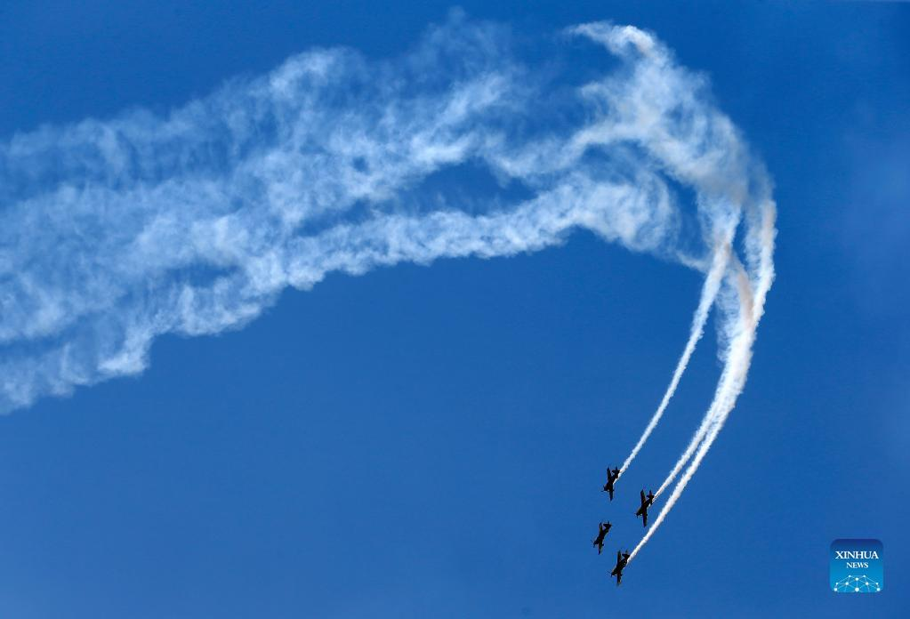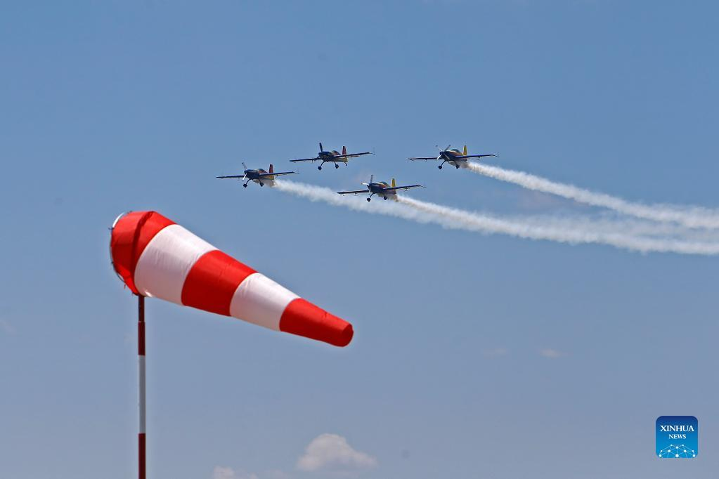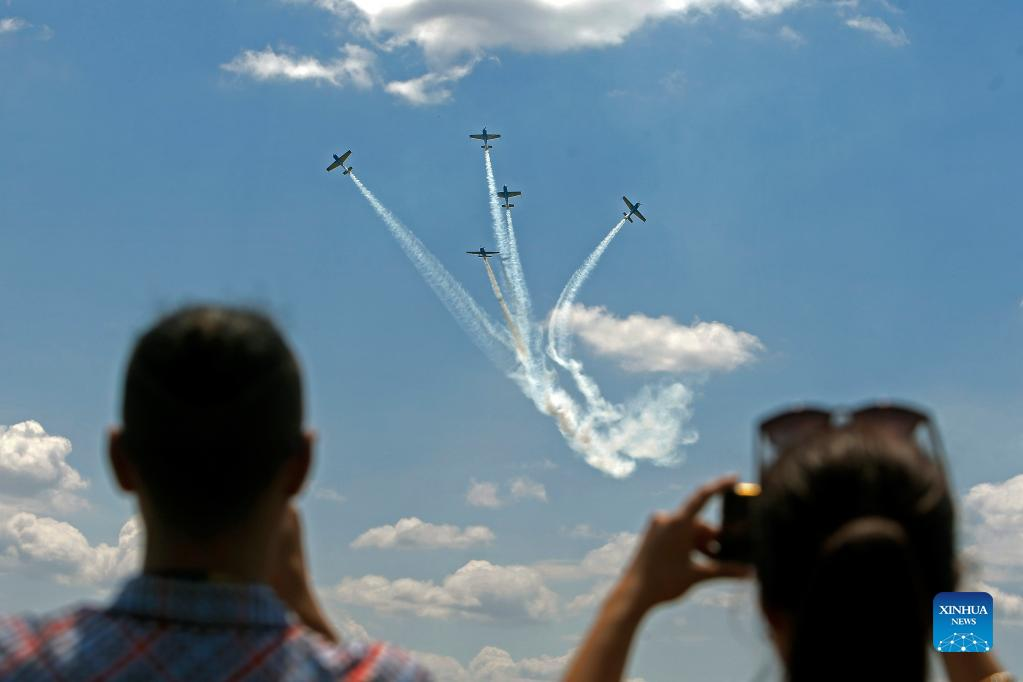 An aerobatic display team performs during Aero Expo Fest near Bucharest, Romania, on June 25, 2022. (Photo by Cristian Cristel/Xinhua)